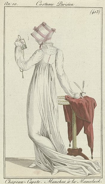 Accessories included hats of all shapes and sizes – black silk caps, velvet with ribbons, turbans with egret feathers, the cornette and the capote. The fashionable carried a tiny handbag, a balantine or réticule, made from lace or silk or even metal, which often hung from the belt.