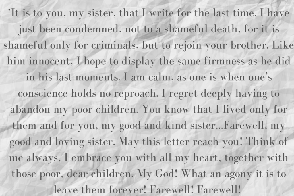 The show trial having been completed, her fate was sealed. Death would be execution by guillotine later that morning, and there would be no last goodbyes with her family. These were her parting words, a letter to one of the few who remained loyal, her sister-in-law Madame Élisabeth: