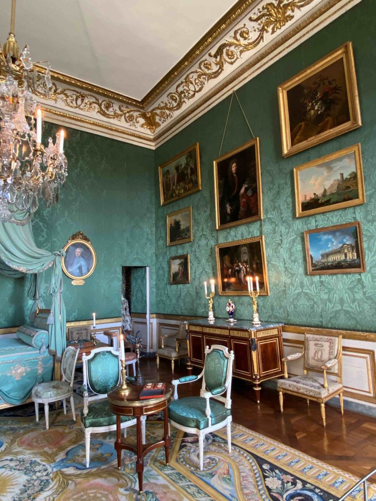 But it was a bedroom all the same, and the objects on display give a glimpse into the world of Madame Thierry. On the bedside table, if you look closely, you can see the treasured fan which was a gift from the queen Marie Antoinette. Perhaps she soothed a crying grandchild in the chair next to the bed, took tea next to the fireplace protected by its silk firescreen, or played a game and gossiped with a close friend whilst sitting at the small table on green damask chairs. Letters were written in the small library which adjoined her room, overlooking the colonnaded terrace, with her armchairs painted white and upholstered in toile de Jouey. It seems like a happy place.